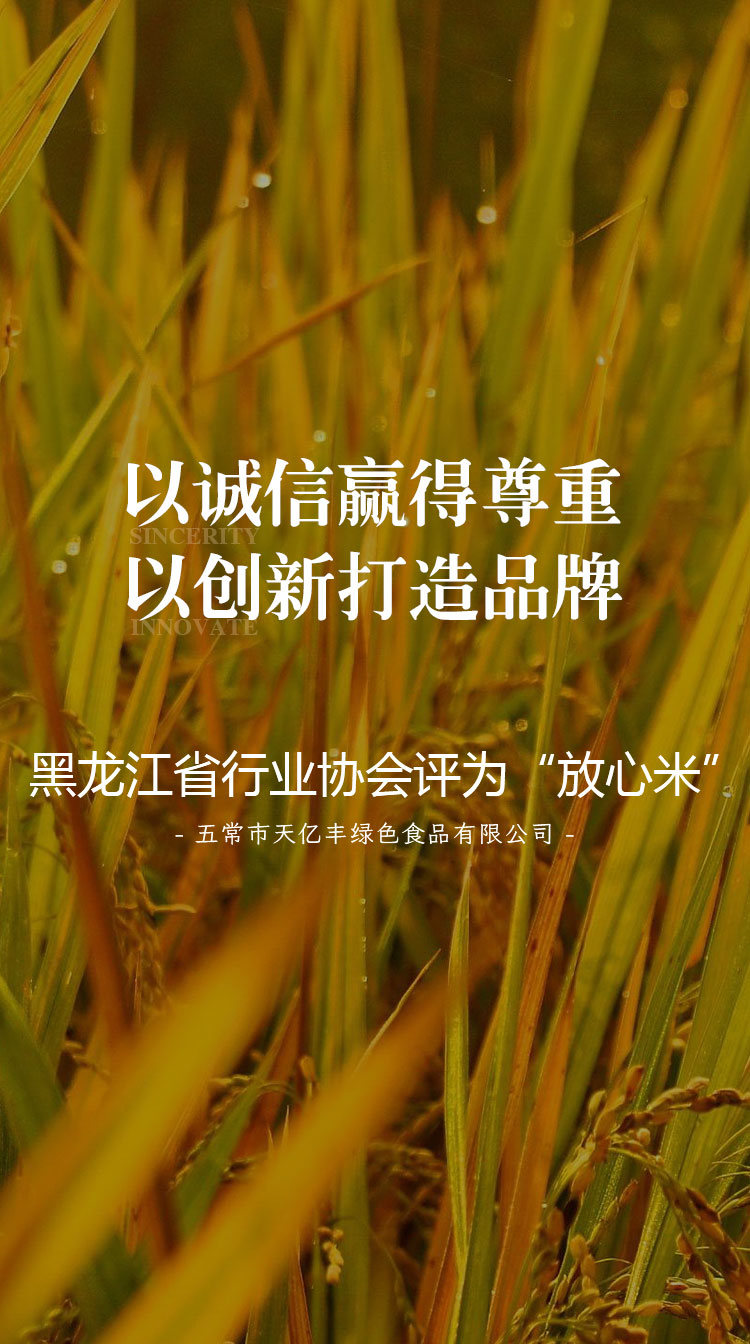 黑龍江省五常天億豐綠色食品有限公司坐落在著名的長白山山脈張廣財嶺下的“大米之都”五常,廠區(qū)占地1000多平方米。擁有兩大條大米生產線,日加工能力為150噸。本公司以質量求生存,以信譽求發(fā)展。產品遠銷全國各地,滿足消費者的需求。